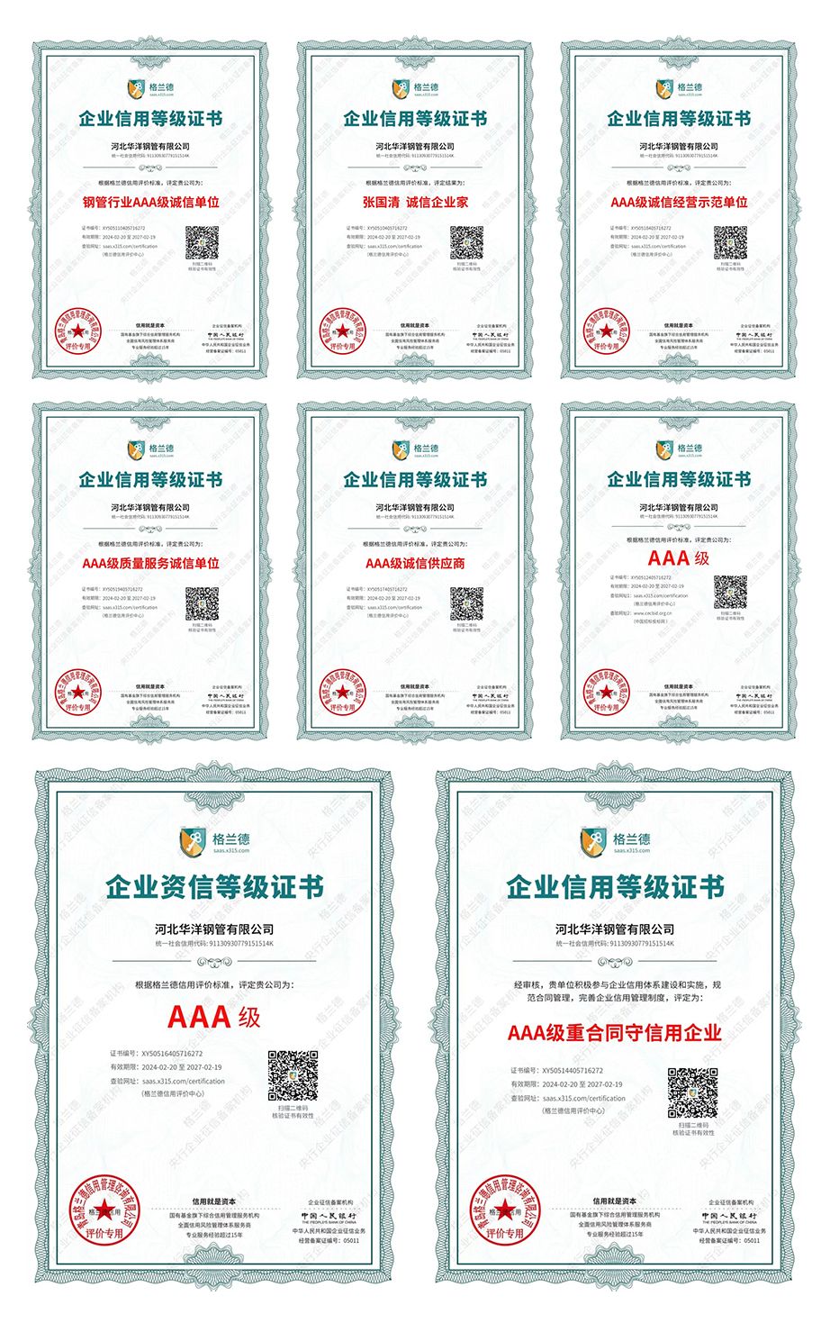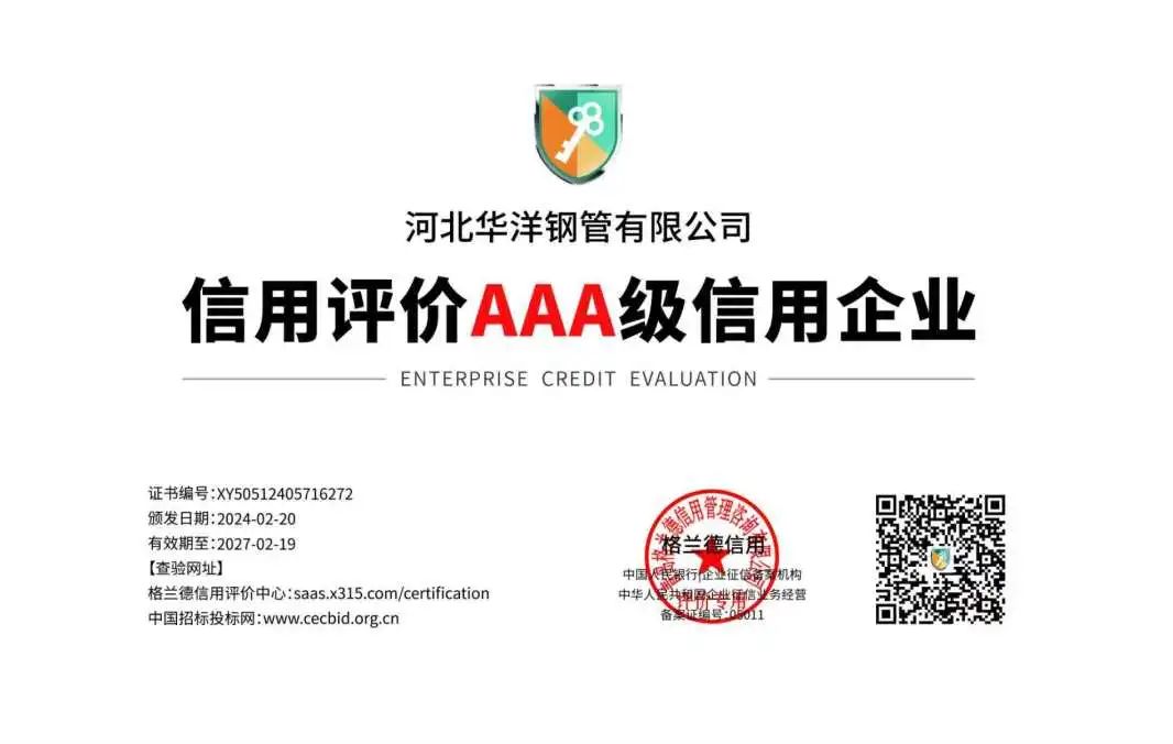 為了進一步證明我們的誠信經營成果,華洋鋼管收獲了眾多含金量極高的誠信證書。這些證書不僅是對我們過往努力的認可,更是我們未來繼續(xù)前行的動力。