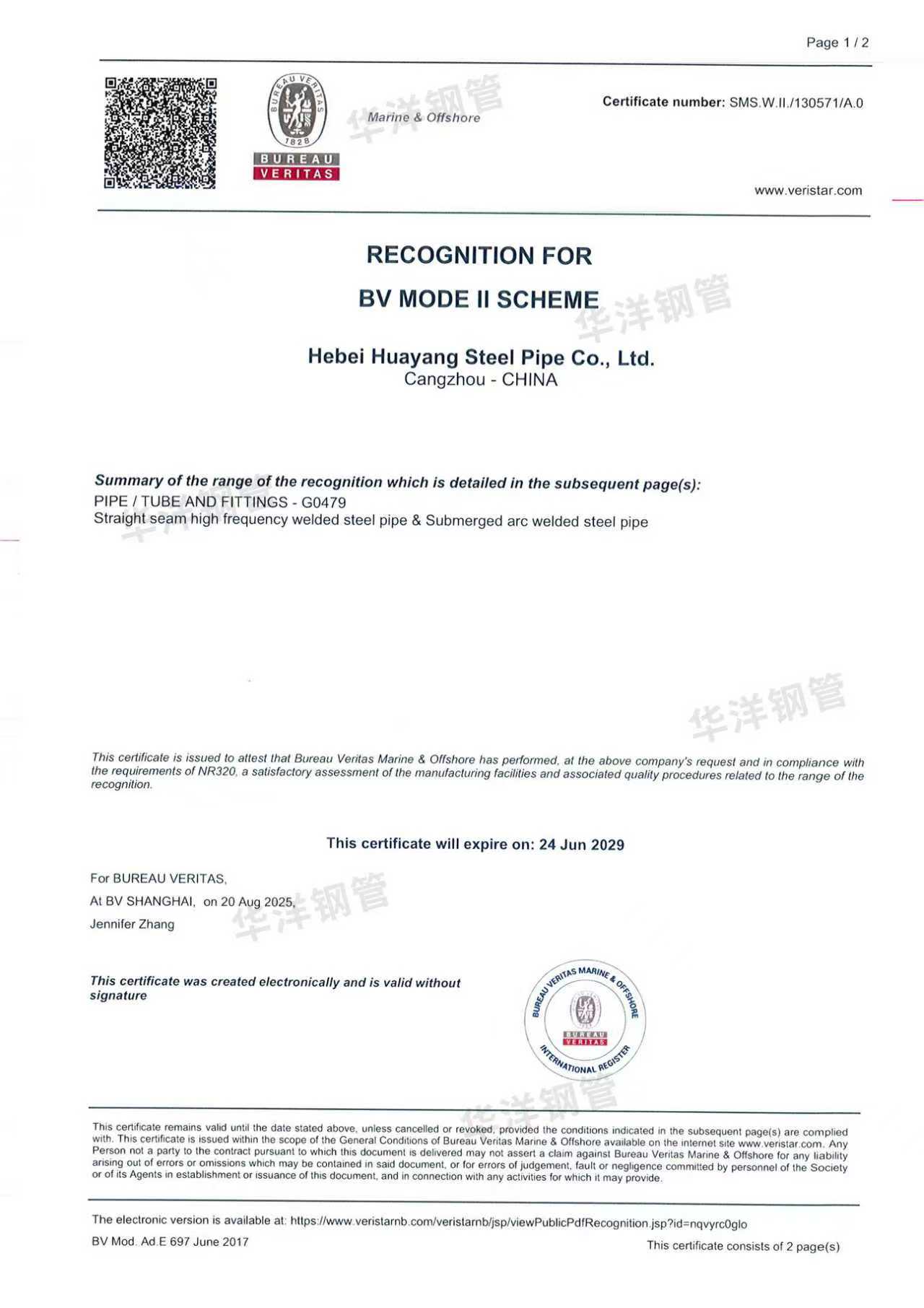 法國船級社(Bureau Veritas,BV)工廠認(rèn)證 的取得,是對華洋長期堅守品質(zhì)與責(zé)任的最好證明,也是華洋邁向全球更高端市場的一次重要躍升。未來,華洋鋼管將繼續(xù)堅持“高標(biāo)準(zhǔn)、嚴(yán)要求、國際化”的發(fā)展路線,用更專業(yè)的產(chǎn)品、更可靠的品質(zhì)、更穩(wěn)健的服務(wù),為全球合作伙伴提供一流的鋼管解決方案。